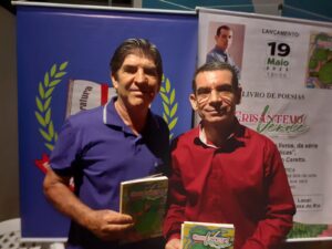 Primeira foto: Édson Ceretta apresentando sua obra, ao lado de Hermélio Silva. Segunda foto: Wander Melo, ilustrador do livro ao lado de Édson ceretta, autor do Crisântemo Verde.