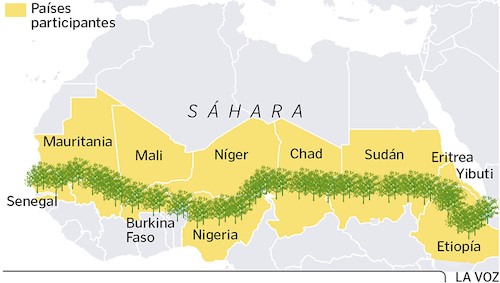 Iniciado em 2007, a iniciativa engloba 20 países africanos, que se compremeteram a plantar árvores em uma imensa área definida, que se inicia na região do Sahel (Tunísia), na fronteira sul do deserto do Saara, um dos lugares mais pobres e áridos do planeta. Em mais de dez anos de trabalho colaborativo, milhões de árvores já foram plantadas.