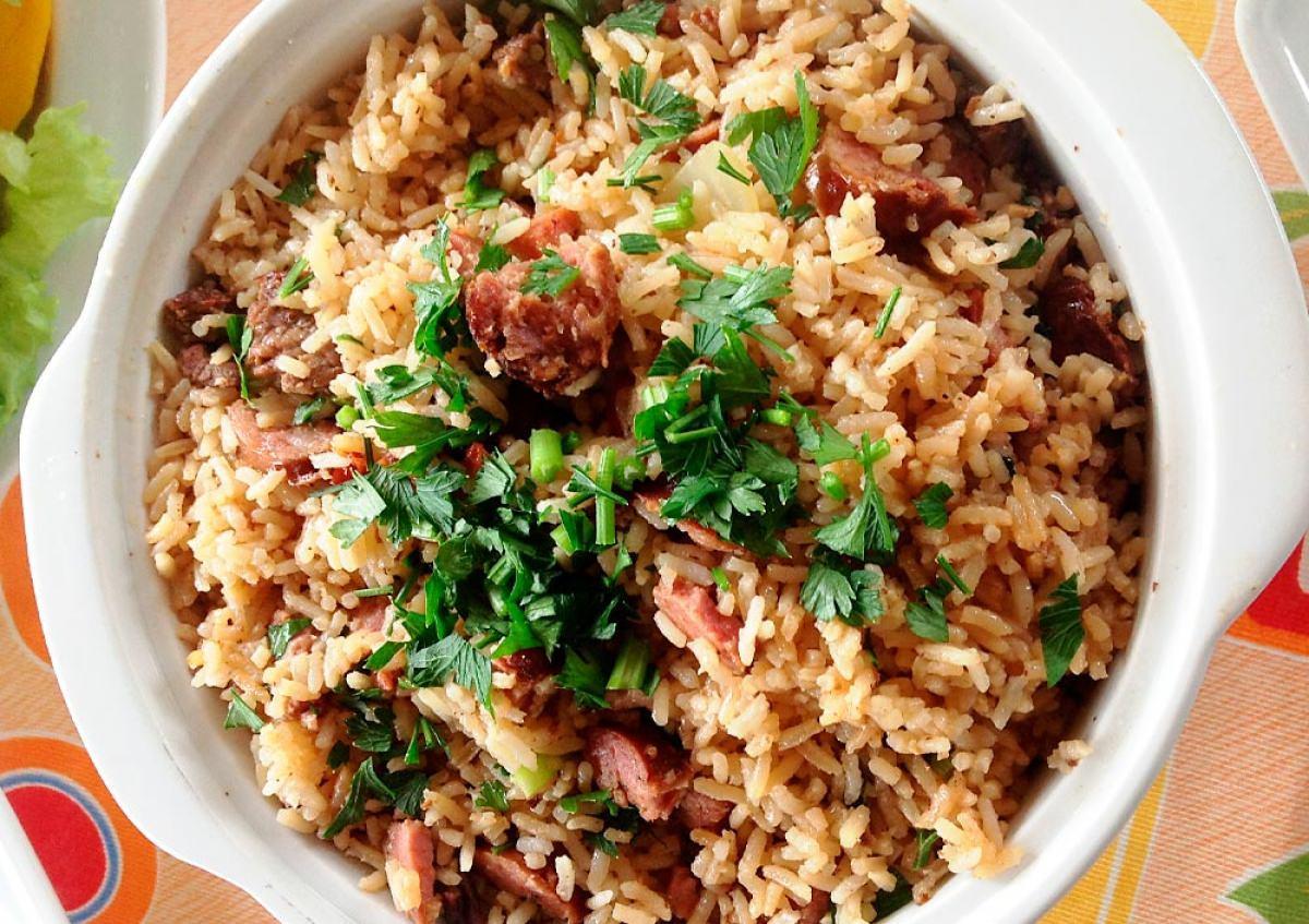 7. Após acrescente o arroz, afogue bem, adicione a água corrigindo o sal se necessário e abaixe o fogo aguardando secar.