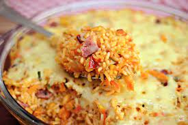 2. No refratário coloque uma camada da mistura (arroz, milho, ervilha e presunto).