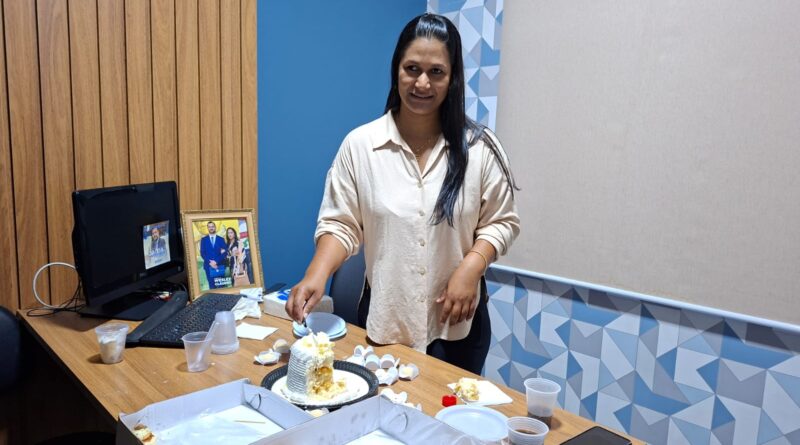 Viviane Ferreira Rodrigues, assessora do vereador Wesley Cláudi, no dia de ontem foi surpreendida pelos colegas de gabinete com uma festa para comemorar seu aniversário, quando se reuniu toda turma que presta serviços ao vereador.