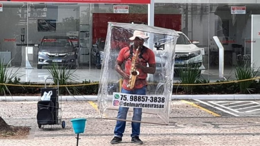 BA: Saxofonista se apresenta nas ruas de Salvador com 'barreira plástica'