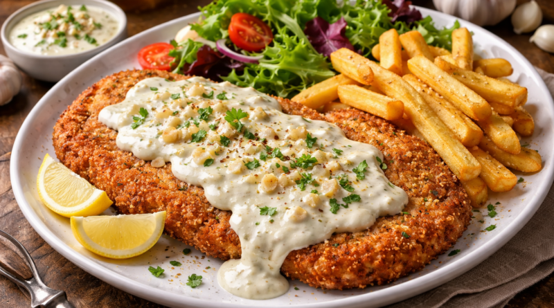 Para o creme de alho, coloque no liquidificador o leite, o alho, sal, pimenta, o vinagre branco, o orégano e bata por 2 minutos. Prove o tempero e acerte se necessário. Ligue novamente e, aos poucos, na velocidade baixa, adicione o óleo. Bata até que o creme fique com a consistência de maionese.  Desligue, coloque em uma molheira e sirva com os bifes reservados. Se desejar, sirva também com batatas fritas e vinagrete.