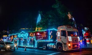 Um dos momentos mais esperados foi a chegada da carreta do Papai Noel, que despertou entusiasmo em toda a praça e fez brilhar os olhos dos pequenos.