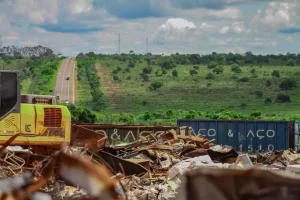 Por trás da “montanha” de sucata na área externa da Aço e Aço, a BR-163 (Foto: Marcos Maluf)