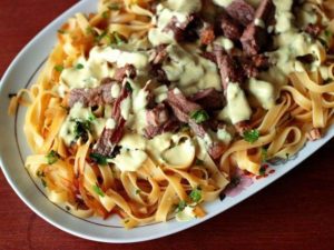6. Ajeite o macarrão na tigela, coloque as tiras do contra filé e finalize com o molho. Sirva imediatamente acompanhado de um queijo de sua preferência.