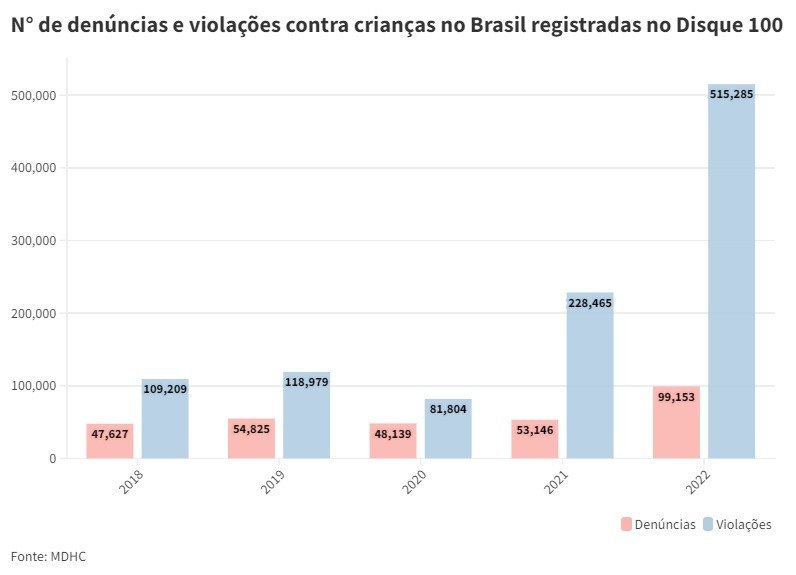 Somente em 2022, o Disque 100 registrou 99.153 denúncias, incluindo física, psíquica e sexual; em 2021, o número foi de 53.146.