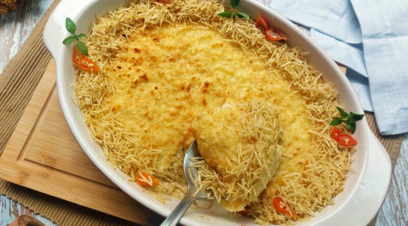 • Transfira a mistura para um refratário e cubra com batata palha.