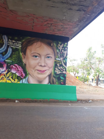 Quinze artistas da cidade de Sinop que participam do projeto cultural, com apoio da secretaria de Cultura da cidade. Homenagearam a ativista sueca Greta Thunberg, de 16 anos, pintando seu rosto no viaduto São Cristovam, o mais movimentado de Sinop.