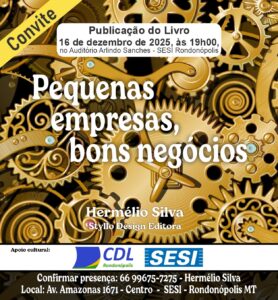 O lançamento do livro “Pequenas Empresas, Bons Negócios”, acontecerá no dia 16.12.2025, às 19h, no “Auditório Arlindo Sanches”, no Sesi, localizado à avenida Amazonas, nº 1.671, Centro, Rondonópolis – MT.