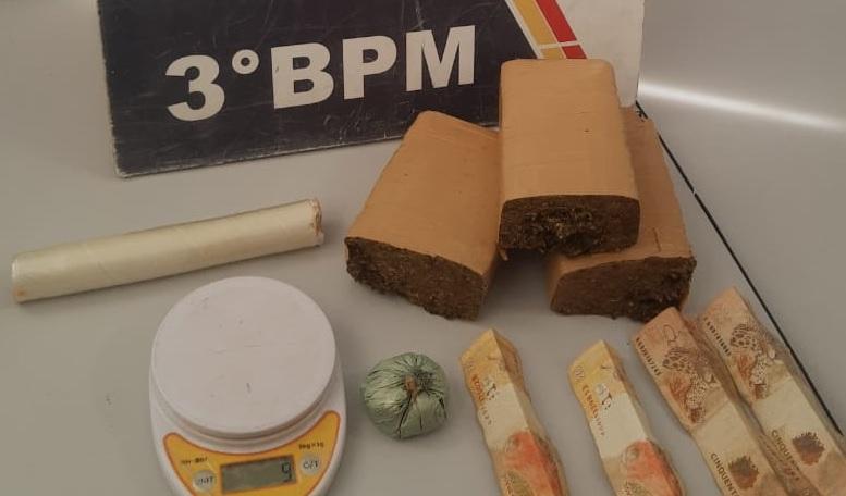Policiais do 3º BPM prenderam nesta segunda-feira (25.01), um rapaz por tráfico de droga, no bairro Jardim Vitória, na capital.