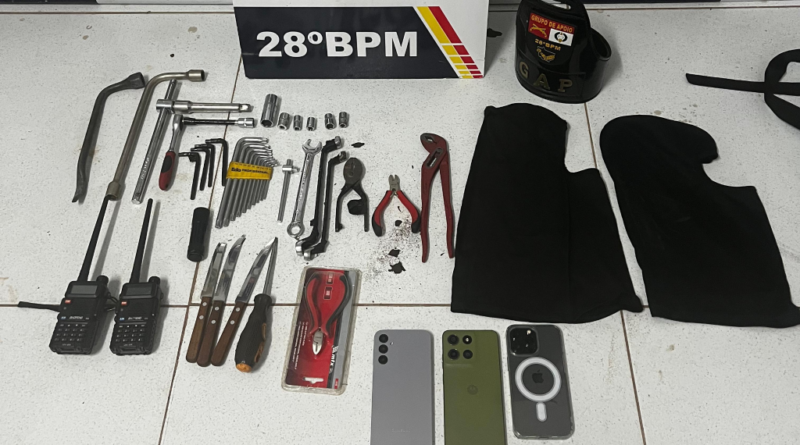 Com os suspeitos, foram apreendidas diversas ferramentas, máscaras e um veículo