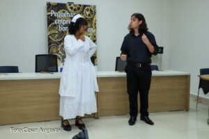 Os atores Rondonopolitanos Amadeu Ferrari e Isabella Nascimento, apresentando a peça, “As dez mais do cortéx cerebal”