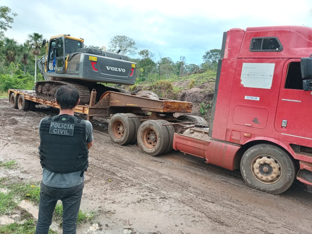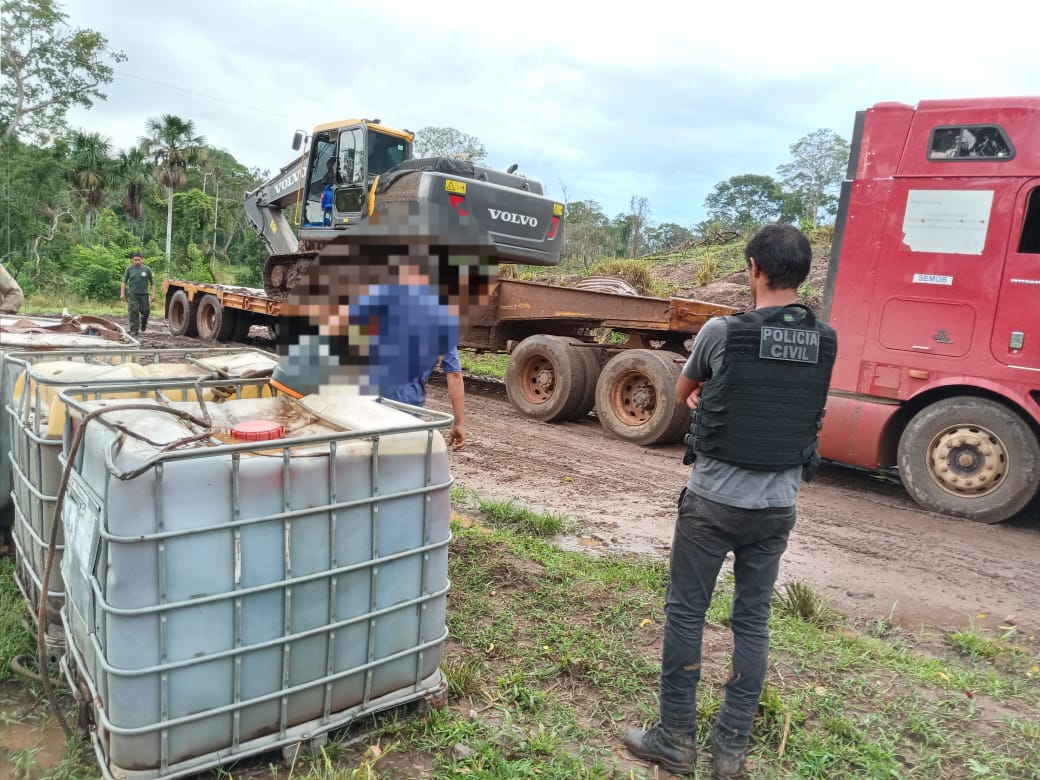 Policiais civis acompanharam servidores da Sema na ação que resultou na apreensão de uma retroescavadeira da marca Volvo e de três mil litros de óleo diesel.