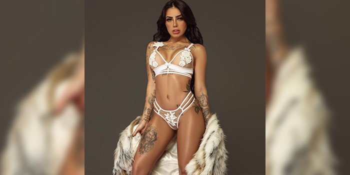 Esbanjando sensualidade com um corpão todo sarado, a morena surgiu de lingerie branca transparente e deixou à mostra sua coleção de tatuagens no corpo, inclusive na região íntima.