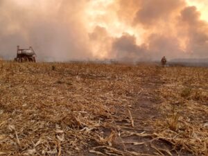 Os bombeiros tentam controlar as chamas para evitar que chegue em outras fazendas da região.