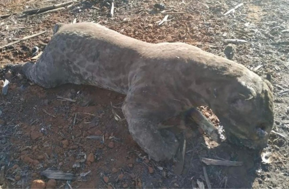 A ONG “É o Bicho MT” divulgou nesta quarta-feira  fotos de uma onça-pintada queimada durante o incêndio que atinge os municípios de Jaciara e Dom Aquino. O animal está carbonizado e com parte dos membros amputados.