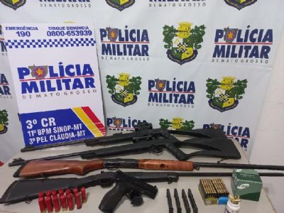 Dois homens, um de 32 anos e outro 36 anos foram presos com armas de fogo, 165 munições de diversos calibres e um veículo Chevrolet S10, em um assentamento no município de Cláudia . Os suspeitos não informaram a origem e destino dos objetos.