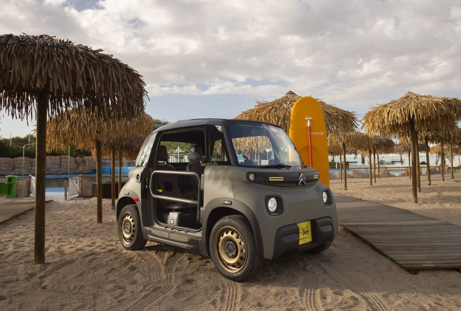 Bem aberto, no lugar das portas, o Citroën My Ami Buggy tem tubos de metal. Também é conversível: há uma tela removível que substitui o teto. A pintura da carroceria tem a cor caqui com detalhes amarelos vibrantes e rodas douradas. As rodas são de 14 polegadas.
