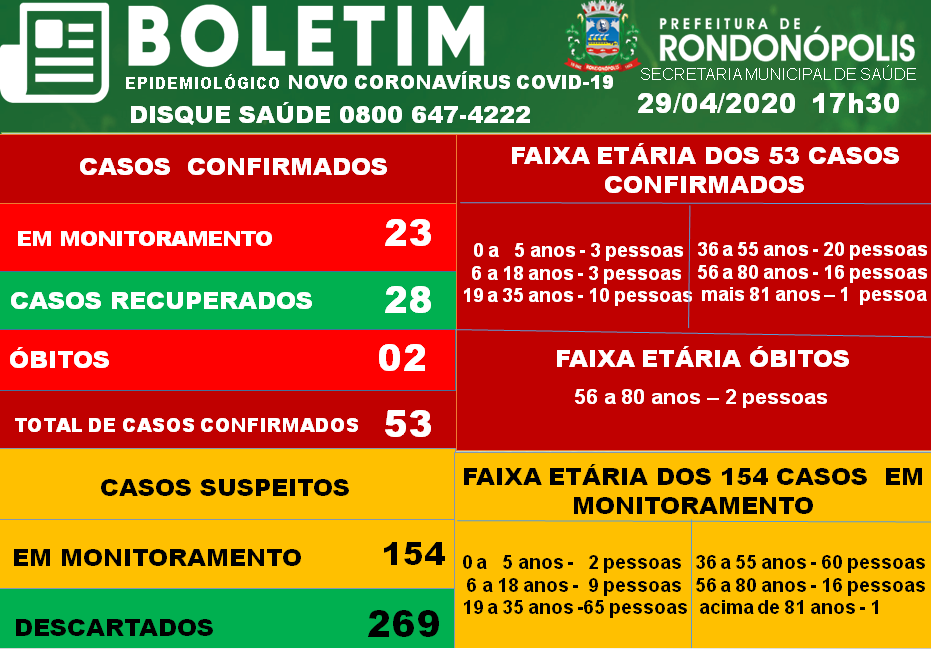 Veja no quadro abaixo, os números de hoje da Covid-19 em Rondonópolis