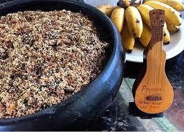 Corte a carne seca em cubos e deixe de molho, de véspera, para dessalgar. Caso tenha pressa, coloque na panela de pressão com bastante água, por uns 25 minutos. Deixe escorrer a água. Refogue a cebola e o alho, até a cebola ficar transparente. Acrescente a carne seca e volte a refogar. Retire com uma escumadeira a carne frita. Coloque a carne seca em um pilão de madeira e pile até ficar desfiada. Misture a carne seca desfiada à mistura de alho e cebola refogados, jogue a farinha e mexa para esquentar. Dê preferência à farinha fina e já torrada.