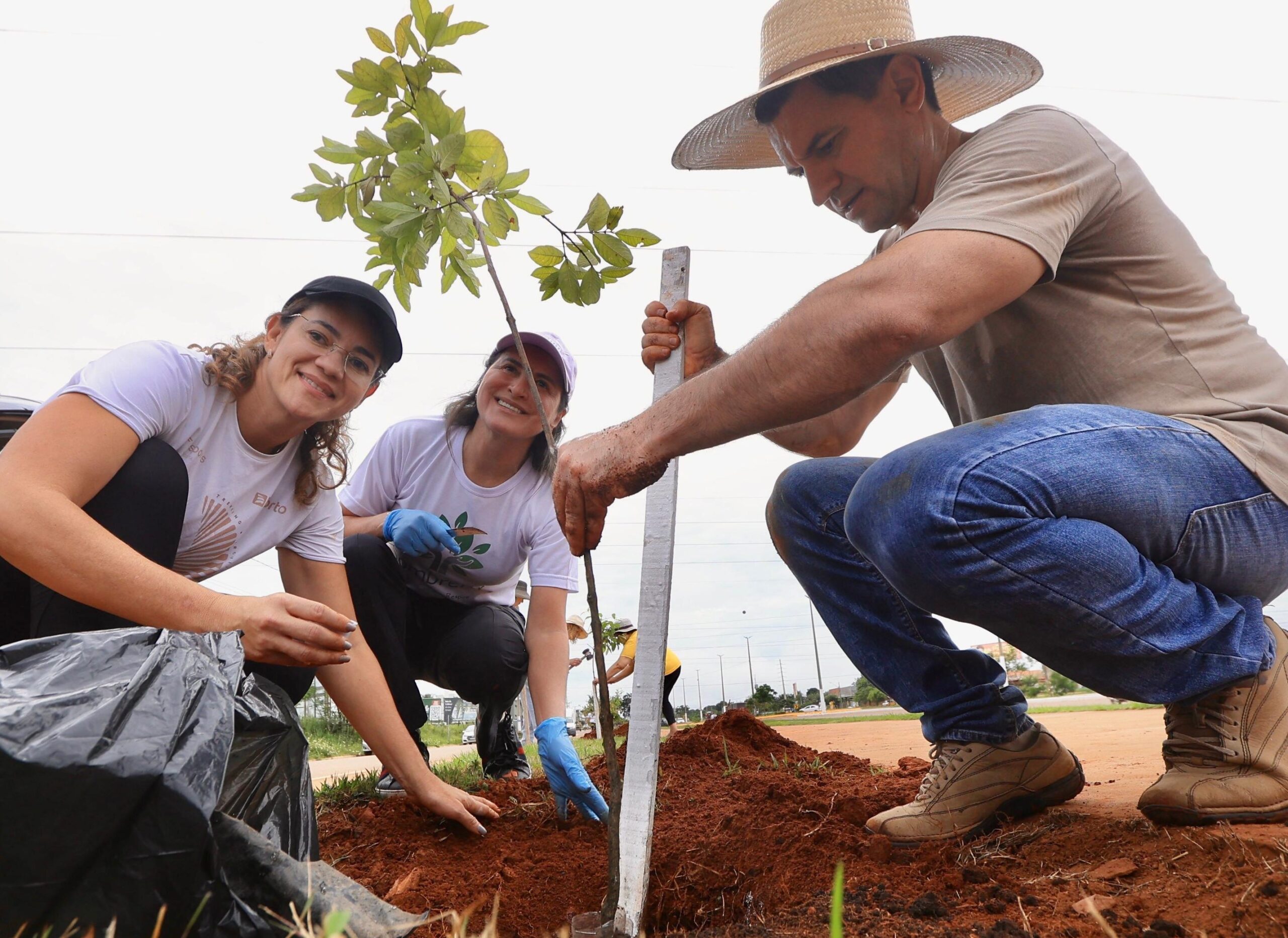 Os voluntários da Ong levantaram cedo, vestiram o uniforme e luvas e colocaram a mão na terra para fazer o plantio das mudas de espécies de Aricá, uma planta nativa do cerrado, resistente ao clima do Centro-Oeste e que na época da florada oferece um visual exuberante.