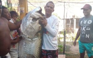 Animal da espécie Camarupim foi pescado neste domingo (6). O pescador levou cerca de 2 horas para retirar o peixe da água.