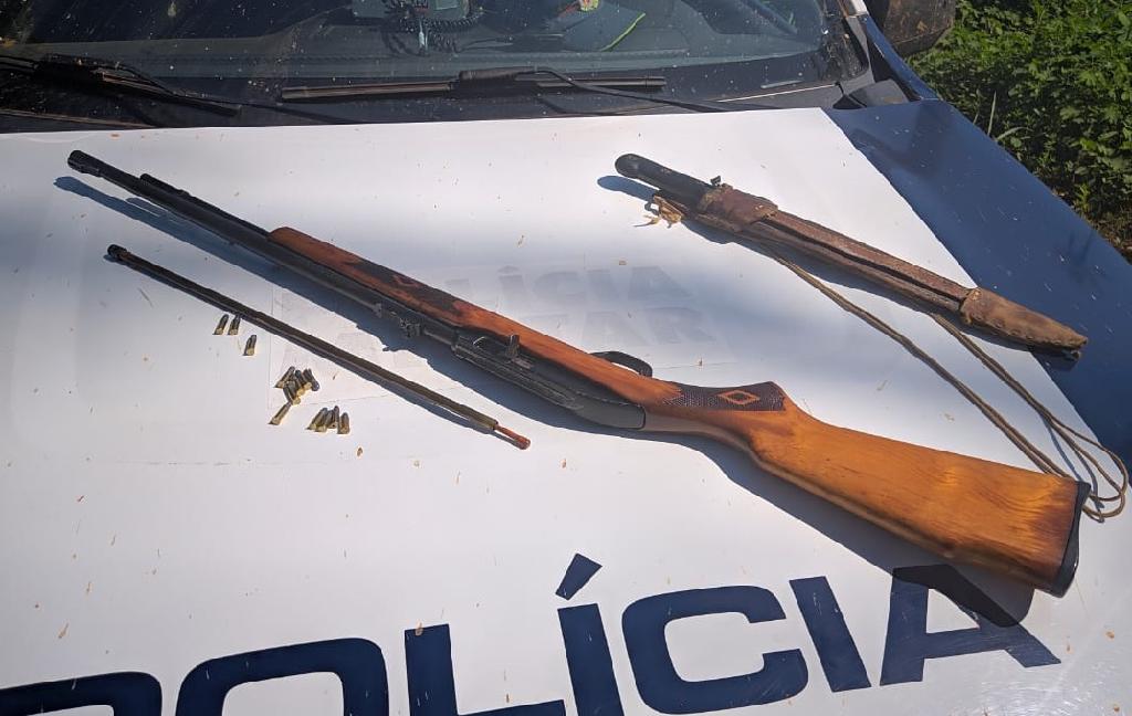 Durante o procedimento que contou com a participação de 17 policiais em cinco viaturas – foi apreendida uma carabina calibre 22, com 13 munições, além de um facão. O dono da arma foi identificado.