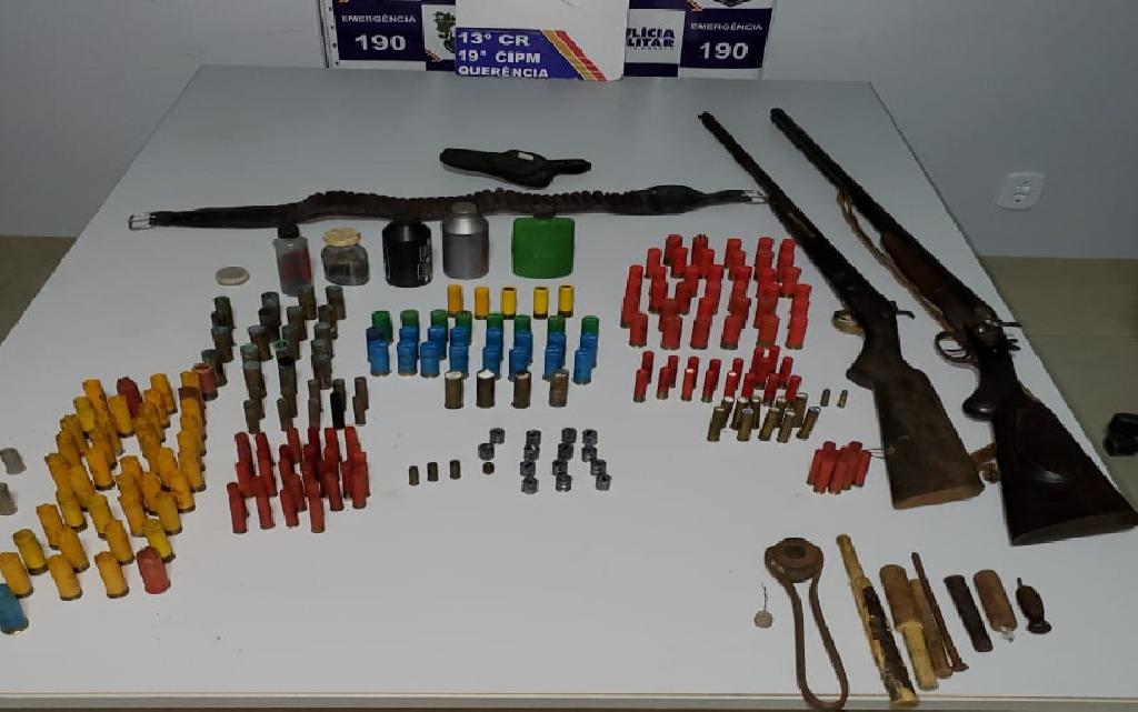 Questionado, o homem disse que teria armas de fogo e estariam em sua casa. No imóvel, os agentes encontraram duas espingardas, sendo uma de calibre 16 e a outra artesanal, além de cartuchos de vários calibres deflagrados, um coldre de couro, um cinto porta balas e 99 munições entre intactas e recarregadas de calibres 40, 12, 20, 32