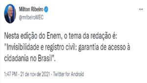 O ministro da Educação, Milton Ribeiro, usou sua conta no Twitter para divulgar o tema da redação do Exame Nacional do Ensino Médio (Enem) 2021. Neste ano, os estudantes precisaram falar sobre “Invisibilidade e Registro Civil: garantia de acesso à cidadania no Brasil”. De acordo com o dado oficial mais recente, cerca de três milhões de brasileiros chegam à idade adulta sem ter certidão de nascimento. E, sem essa certidão, também ficam impedidos de tirar todos os outros documentos.