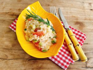 Risoto de cenoura, abobrinha e calabresa