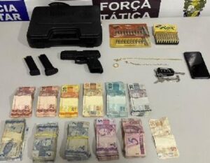 A equipe atendeu uma denúncia anônima e localizou o suspeito portando uma pistola 9mm, 70 munições e cerca de R$ 10,8 mil em dinheiro.