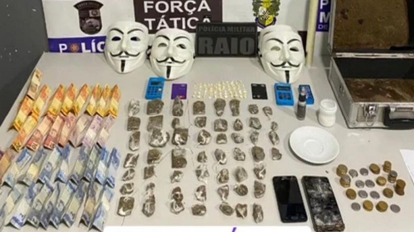 No local, foram encontrados 70 porções de cocaína, 53 de maconha, R$ 358 em espécie e diversos materiais utilizados para embalagem e venda dos entorpecentes. Além disso, os policiais encontraram cinco máscara Anonymous – grupo de hacktivistas.