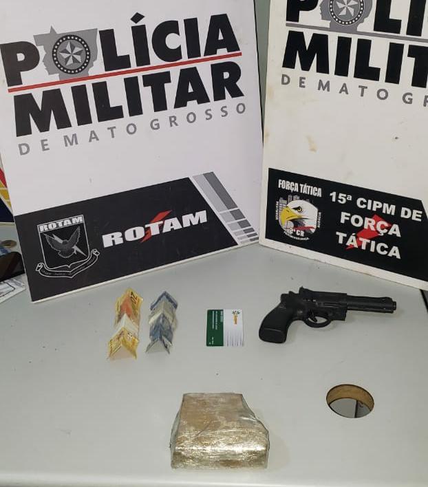Na abordagem, a PM apreendeu com o homem uma barra pequena de maconha que estava escondida nas partes íntimas e R $22.  Os militares voltaram ao local onde o suspeito havia dispensado a arma, que foi constatado que se tratava de um simulacro de revólver.