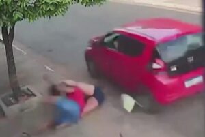 A mulher, que conduzia um Fiat Mobi de cor vermelha, foi flagrada pelas câmeras de segurança no exato momento em que atropela o casal, que estava em uma motocicleta.