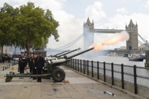 Uma salva de tiros é disparada para o rei Charles na na Torre de Londres. — Foto: REUTERS/Sarah Meyssonnier